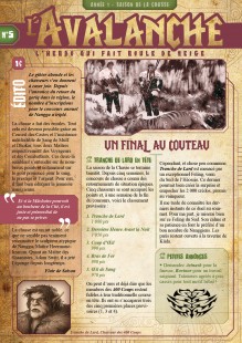 Ce cinquième numéro de l’Avalanche met à l’honneur le concours de chasse annuel qui a lieu dans la Mâchoire. En cette période riche en gibier, il semblerait que les membres des 400 Coups, habitués à occuper le podium, doivent faire une place pour un Feling venu du Sud de l’Héossie… Qui est donc ce mystérieux Voyageur qui a su gagner le cœur des Nanggiens ?…