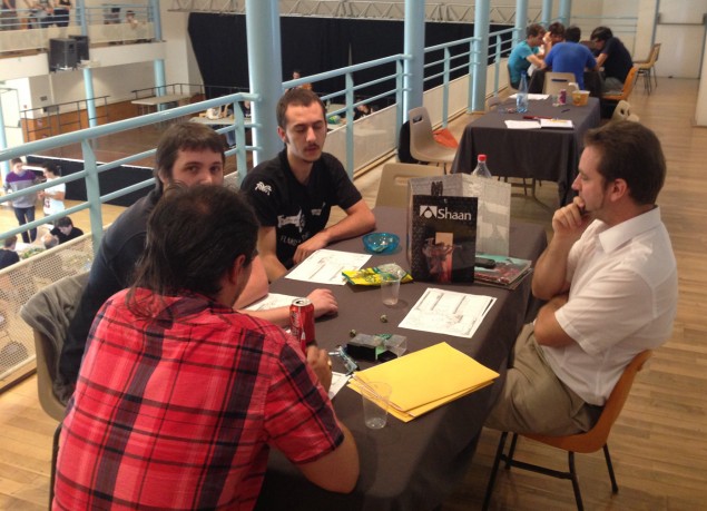 L’originalité du système de jeu ainsi que la pression incessante de la nécrose qui guette à tout instant, en a conquis plus d’un. Si bien qu’à 18h notre MJ aux bouquins poussiéreux a réuni une table de nos plus vaillants testeurs et se lance dans la confection du tout premier one-shot de Shaan maison. Nos huit joueurs ont donc participé à une représentation en l’honneur des humains. Mais 20 ans après, l’animosité entre les races couve toujours, et surtout pourquoi devrait-on honorer les humains, eux qui ont accédé à la domination par la force ? Que vous soyez humain, extraterrestre ou indigène, il vous faudra vous positionner dans cette lutte, guerre froide sous-marine et aux révoltes qui couvent telle un une braise ardente sous la paille.